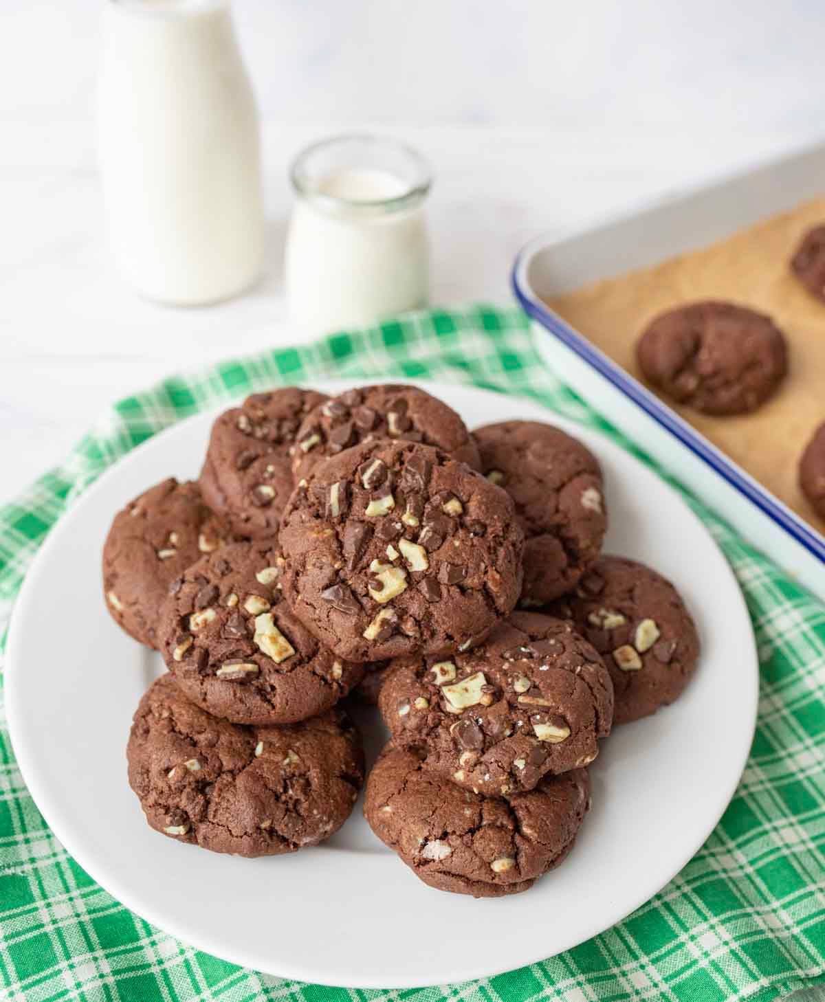Thick, fudgy, and loaded with chocolate-mint flavor. Made with cocoa powder, brown sugar, and Andes mint pieces for the perfect brownie-like cookie, these are a festive holiday choice for parties and gifting!
