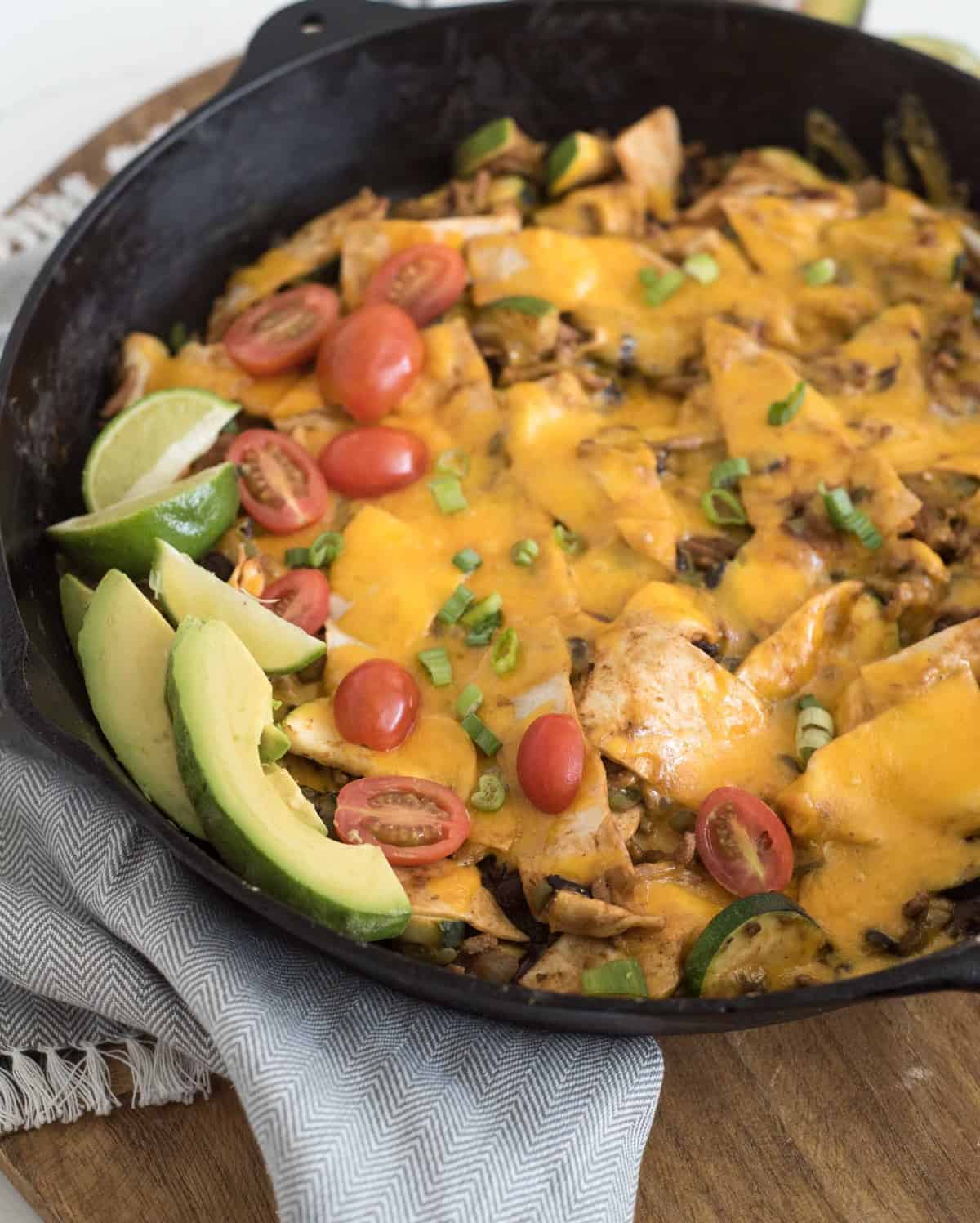 One pan chicken enchilada casserole made on the stove top with chicken, enchilada sauce, veggies, and tortillas in less than 30 minutes, for an easy dinner.