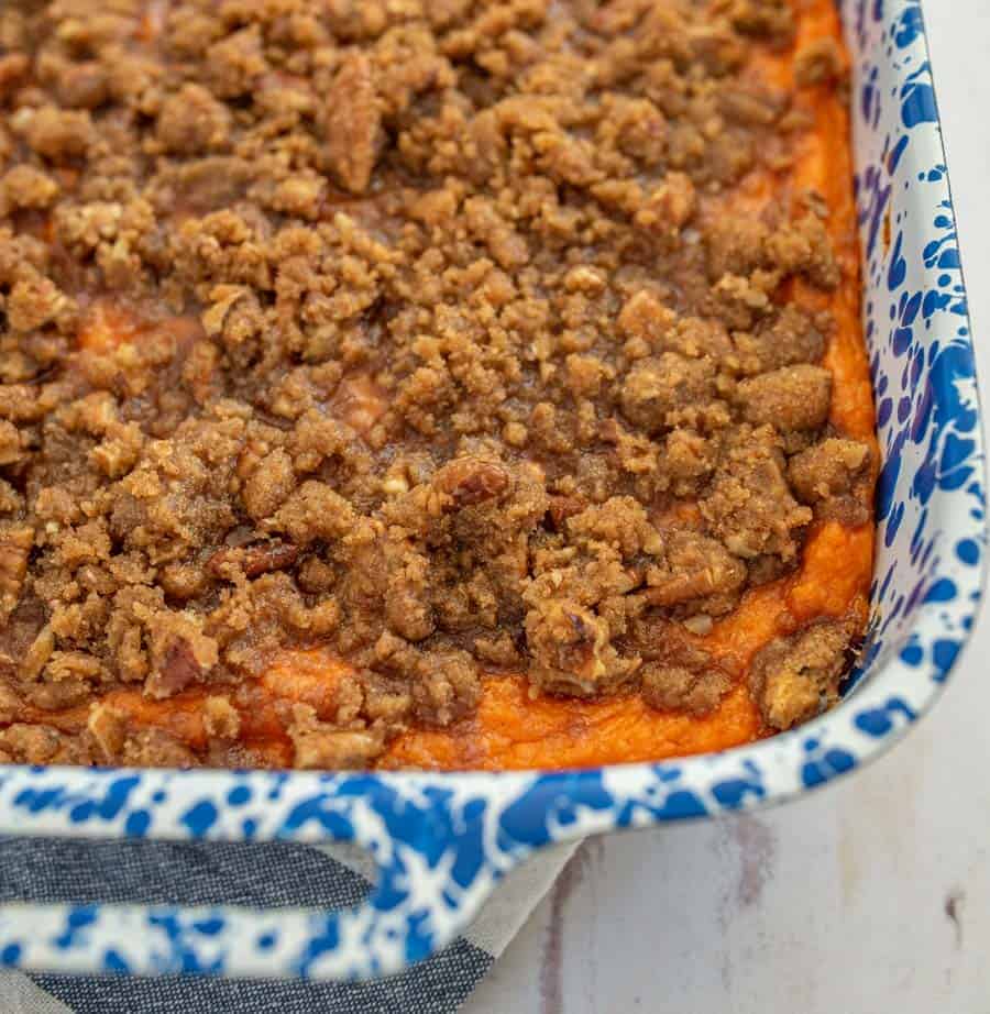 This luscious sweet potato favorite can be made a few days ahead and can even be frozen! Keep the casserole and streusel topping separate until time to bake, and then follow the recipe instructions for the time to bake and add the topping.